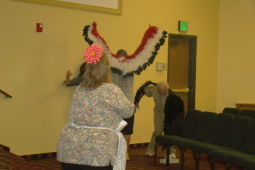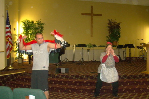 That same day we had rehearsal a small rehearsal with the main cast: Cazaq, the 3 elder eagles (Wisda, Deter and Compa), Mother Chicken, Sister Chicken and Mr. Raven. While we were serious about our rehearsal, it was hard to keep a straight face when you have someone as funny as Mother Chicken in the play! Trudi, the actress portraying Mother Chicken, is a born comedienne with a witty comment for everything and everyone. By night, Mr. Raven is chicken-stealin’ thief, but by day, he is really an engineering genius! Steve, the actor playing Mr. Raven, is the mastermind behind Lonely Egg. The director (also the authoress of the book) had a vision of what she wanted the egg to look like. 5 days later, Steve came back to us with full skeleton of Lonely Egg! We really owe him so much!
