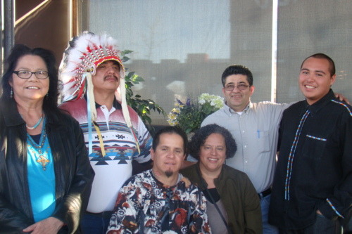 The cast in a group photo with Edwin Vasquez (from left to right) Narrator – Marilyn Bread, Wisda – Leon Vielle, Compa – Jordan Skinner, Author/Director – Teresa Skinner, Edwin Vasquez, Cazaq The Eagle – Joey Bread.